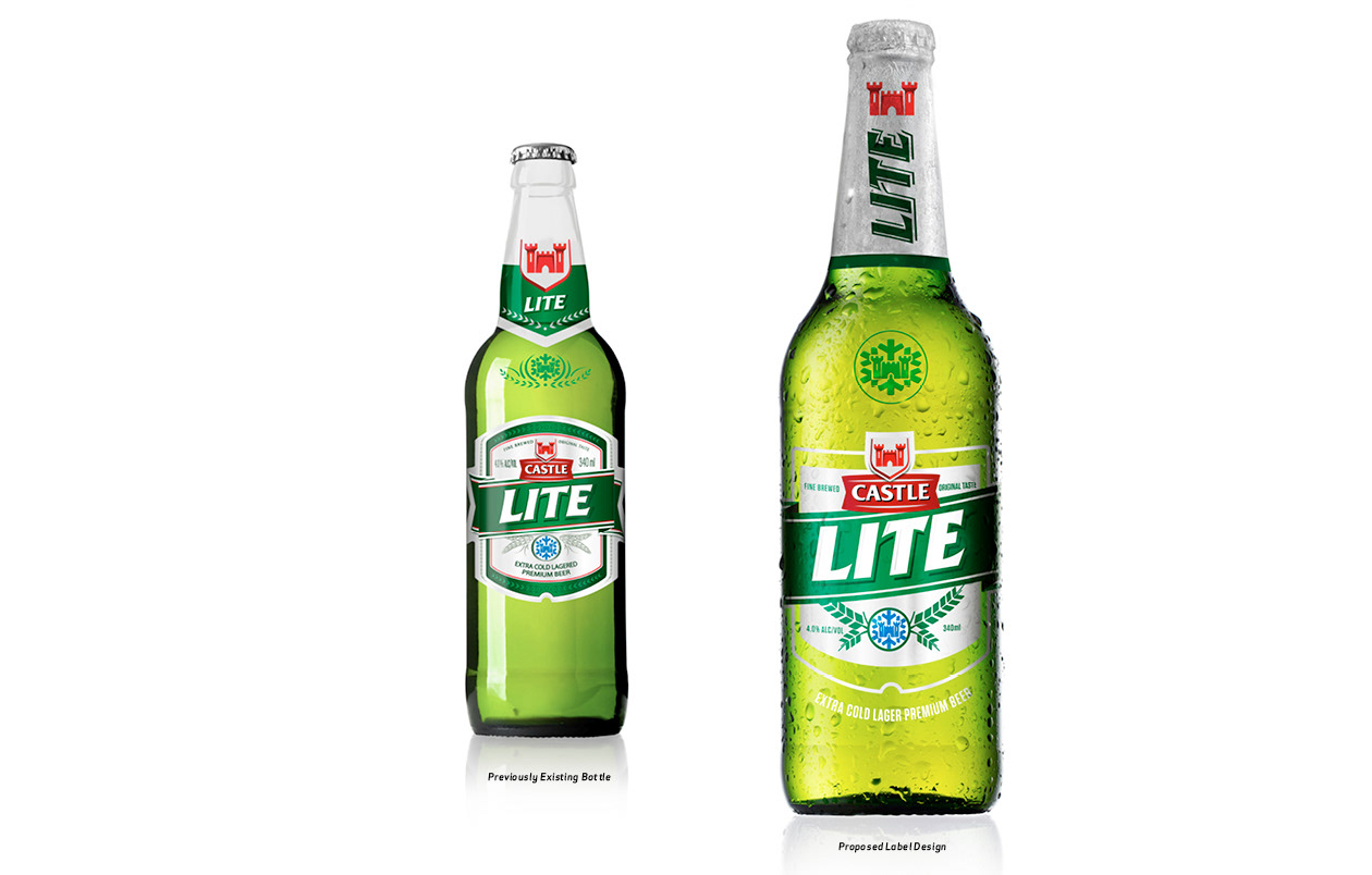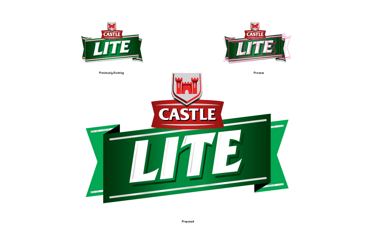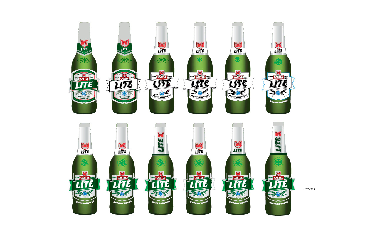 In December 2012 the South African beer Castle Lite bottle design went out to pitch. We didn’t win the pitch but this was my evolutionary craft process. For me it was important to respect the bottle and the existing label, in order to avoid alienating its already huge following, but at the same time “refresh” and update.